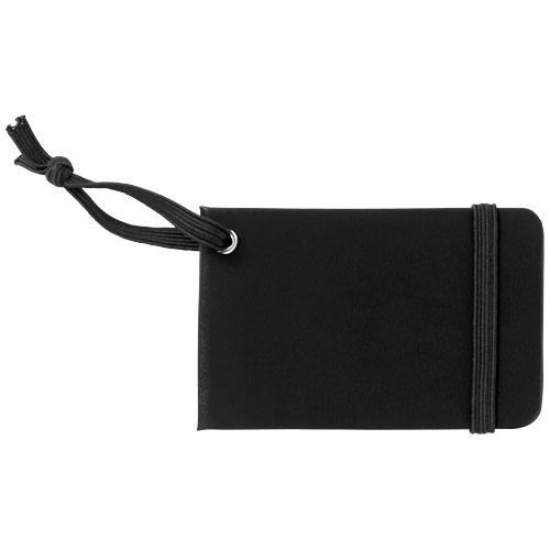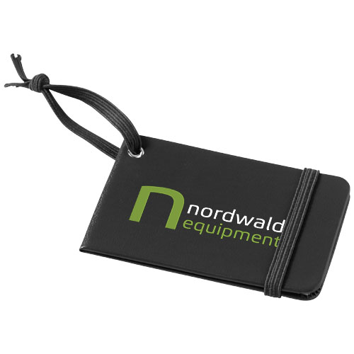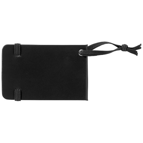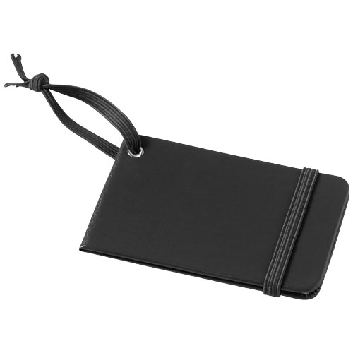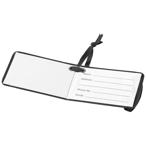 Plakietka identyfikacyjna do bagażu z pasującym zamknięciem i gumką do przyczepienia. Etykietka zawiera miejsca na personalia, adres, telefon i adres e-mail. Papier imitujący skórę.