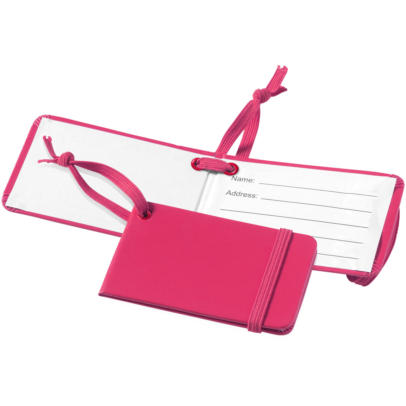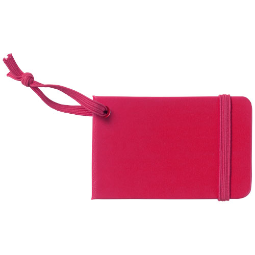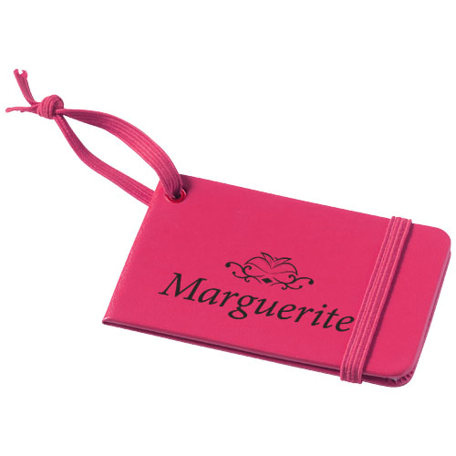 Plakietka identyfikacyjna do bagażu z pasującym zamknięciem i gumką do przyczepienia. Etykietka zawiera miejsca na personalia, adres, telefon i adres e-mail. Papier imitujący skórę.